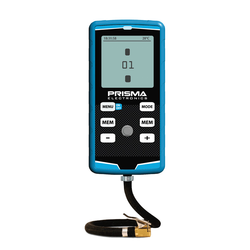 Manómetro digital de alta precisión HI.PRE.MA 4 fabricado por Prisma Electronics, con un rango de 7 BAR/101 PSI y gran precisión de 0,1%. Permite ver la presión de los 4 neumáticos a la vez en la pantalla.